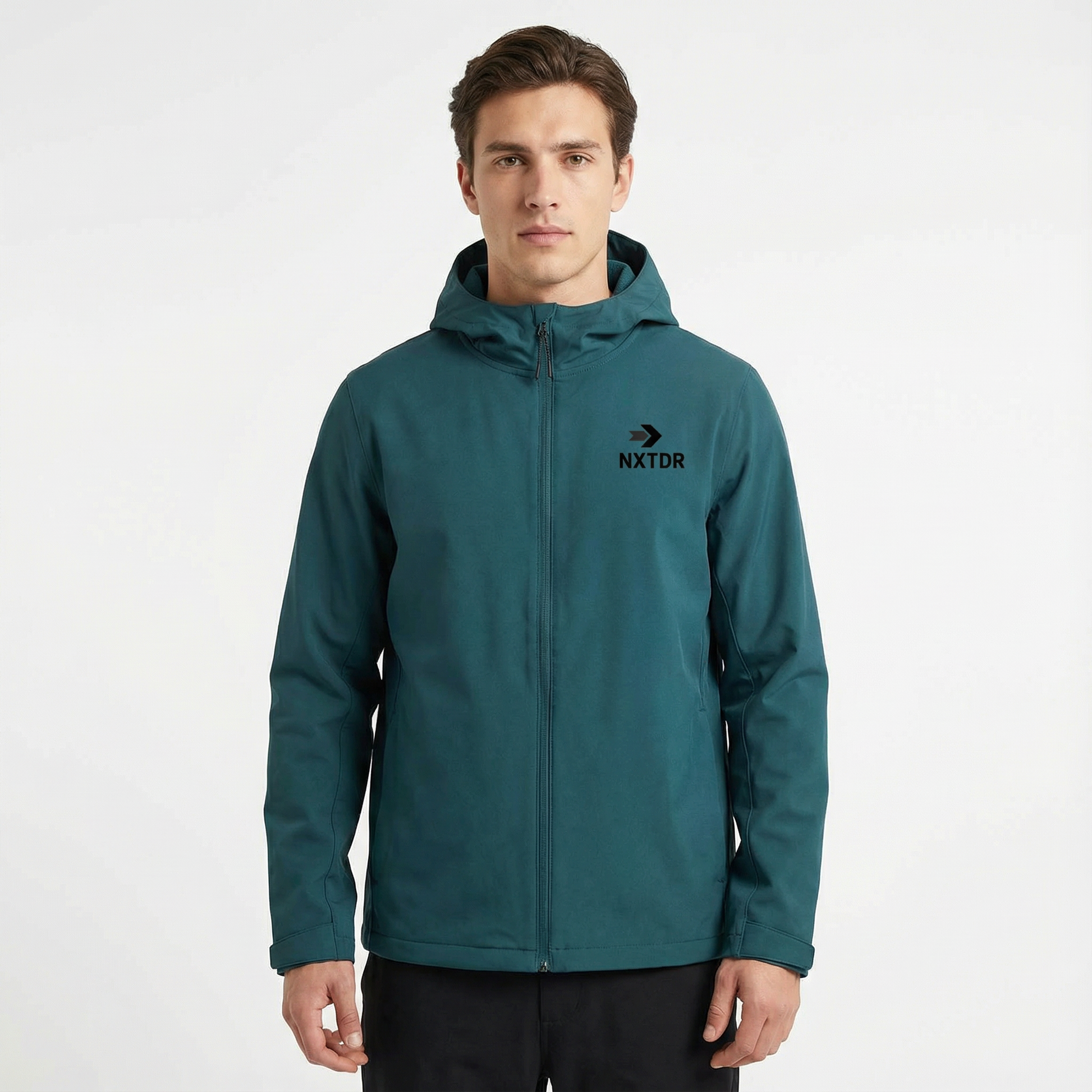 Herren-Softshell-Jacke mit Kapuze | Eingesetzte Ärmel | Hoher Kragen und mehrteilige Kapuze | Kapuzenöffnung und unterer Saum mit verstellbarem Kordelstopper aus Polyester und elastischer Kordel | Nahtverdeckter Reißverschluss vorn mittig | Paspeltaschen mit Reißverschluss mit reflektierendem, elastischem Zugband | Vollständig verklebtes Fleece-Innenlayer | Seitliche Einsätze und Stretchpartien für besseren Sitz | Mit Klettverschluss regulierbare Ärmelöffnungen | Innennähte mit recycelter Einfassung | Wasserabweisend, atmungsaktiv und winddicht